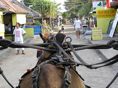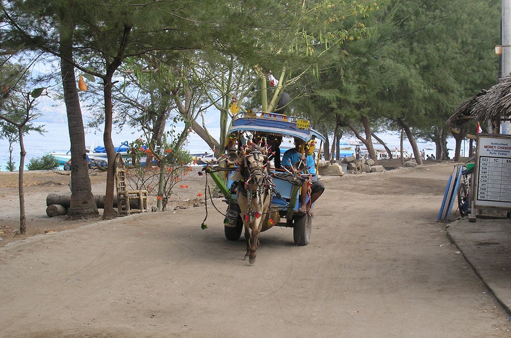 La quiete è sicuramente dovuta anche alla mancanza di mezzi di trasporto a motore: a Trawangan, o si gira a piedi, o ci si muove a cavallo, in carrozza e in bici; non esistono infatti nè automobili nè scooter.I soli rumori degli zoccoli dei cavalli al tramonto rendono ancor più mistica l’atmosfera del villaggio dove sembra di vivere negli anni ’50, alla penombra di pochissime luci. I rossi tramonti sul mare aprono le porte alle notti ‘magiche‘ dei funghi allucinogeni venduti in molti locali dell’isola insieme ad altre sostanze da sballo… sarà anche questo uno dei motivi che rende gli abitanti così tranquilli? per alcuni sicuramente si. Sapendo che in Indonesia vige la pena di morte per il possesso di droga mai ci si aspetterebbe di trovare un isola hippie dove ci vengono spesso proposte droghe di tutti i tipi, fortunatamente senza troppa insistenza: basta declinare gli inviti con gentilezza e sorrisi e nessuno insisterà.