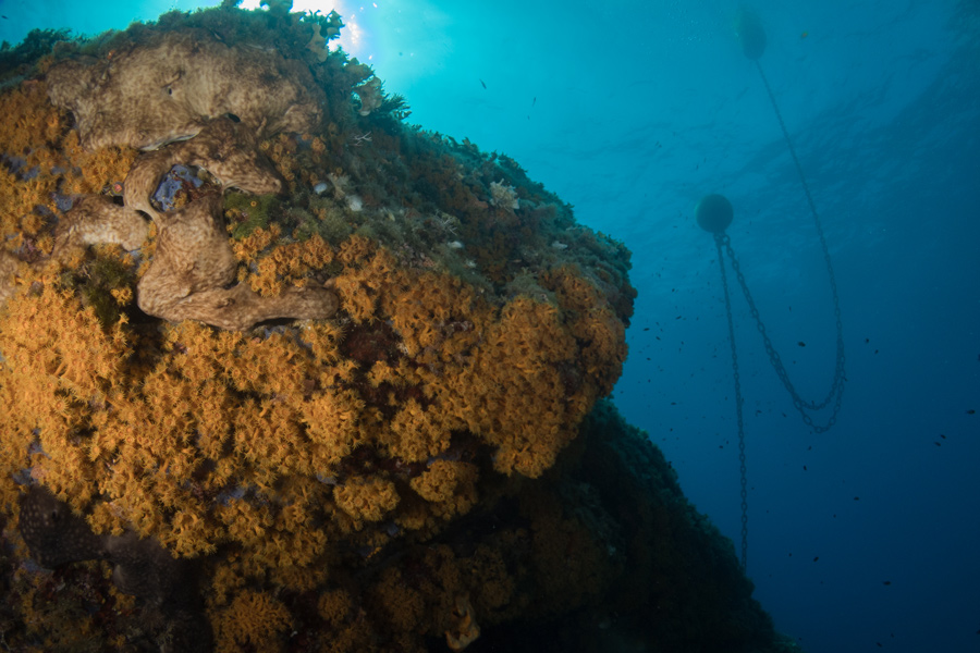 A partire dagli 8 metri di profondità, possiamo ammirare un “picco” interamente ricoperto di margherite di mare (Parazoanthus axinellae) che con il loro giallo brillante illuminano letteralmente la parete. Popolano il pinnacolo anche spugne viola e arancioni che creano una tavolozza di colori che lascia incantati.
