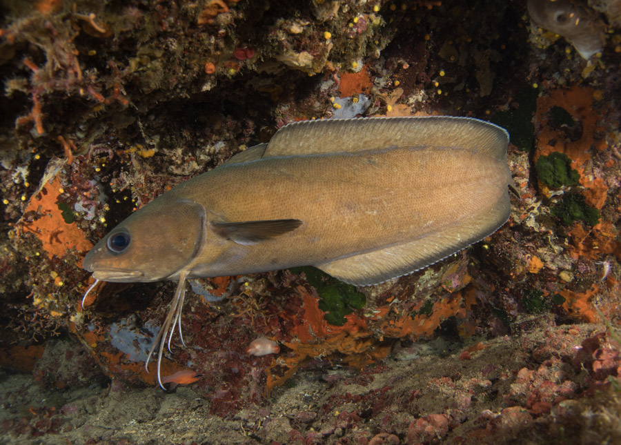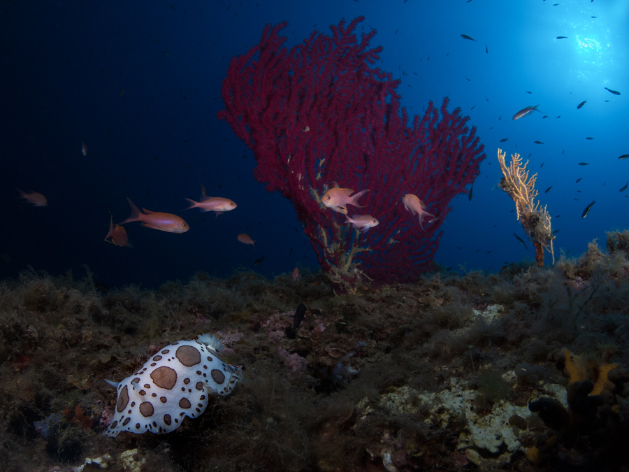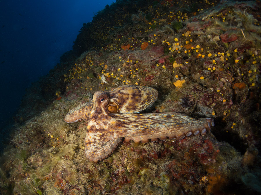 Si scende lungo la parete, nelle tane e negli anfratti rocciosi possiamo osservare una varietà di creature affascinanti: dai nudibranchi, la cui presenza varia stagionalmente da specie a specie, agli scorfani e poi ancora musdee e polpi che giocano a nascondino spostandosi tra le loro numerose tane. Non mancano incontri con murene e gronghi che si affacciano curiosi dai loro rifugi approfittando spesso dell’attesa per farsi pulire da meticolosi gamberetti. Lungo la nostra esplorazione saremo silenziosamente seguiti da piccole cernie che come condomini curiosi osserveranno ogni movimento di questi strani visitatori e delle loro bolle.