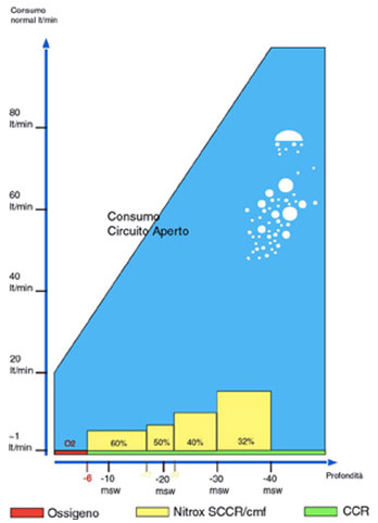 Sono, quindi, subito evidenti i vantaggi in termini d’autonomia: il metabolismo umano consuma circa un litro il minuto d’ossigeno a qualsiasi profondità, mentre la ventilazione in superficie è di circa 20 litri il minuto ed aumenta in ragione d’altri 20 litri ogni 10metri di profondità, ventiliamo quindi decine di litri il minuto per fornire all’organismo un solo litro al minuto d’ossigeno.