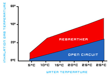 Grande è anche il vantaggio termico di questi apparati, il gas che ventiliamo è riscaldato ed umidificato sia dal nostro organismo, sia dalla reazione dell’assorbente della CO2, la calce sodata, che produce calore ed umidità, mentre il gas inalato da un Circuito aperto è secco e raffreddato dall’espansione: potremo così indossare una muta umida in luogo di una stagna oppure una muta umida più leggera. Questo vantaggio assume importanza ancor più rilevante con l’impiego di miscele non narcotizzanti, a causa della presenza dell Elio, che è grande conduttore termico .