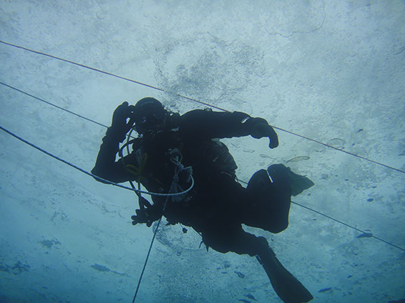 Ci spostiamo sotto e le nostre mani sigillate dentro i guanti stagni scorrono su