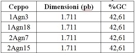 In tabella 3 sono riportati le dimensioni e il contenuto percentuale in GC delle sequenze ottenute: come si può osservare tutte le sequenze presentano una stessa dimensione ed uno stesso contenuto in GC.