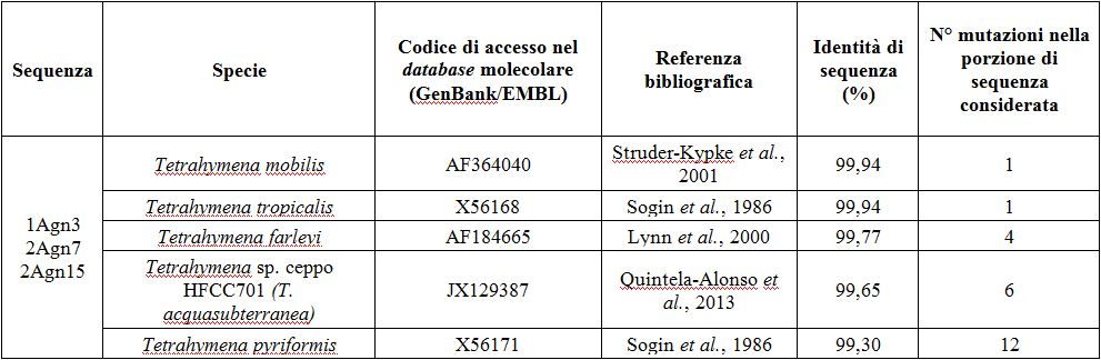 I ceppi provenienti dal sito Grotta dei Laghi sono stati assegnati tassonomicamente al genere Tetrahymena in quanto le sequenze ottenute differiscono per una sola differenza nucleotidica con le corrispondenti sequenze omologhe di riferimento presenti nel database molecolare. Inoltre, si ritiene che le specie isolate siano nuove specie appartenenti al genere Tetrahymena: questo genere presenta un valore di divergenza intraspecifica minore del 1% (Kher et al., 2011); ad esempio T. mobilis e T. tropicalis, due specie strettamente correlate da un punto di vista filogenetico, differiscono tra loro per una sola mutazione nucleotidica.