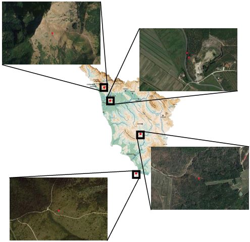 Sono stati selezionati cinque siti di campionamenti (Figg. 3, 4), distribuiti in diverse aree della Toscana e con caratteristiche geomorfologiche diverse.
