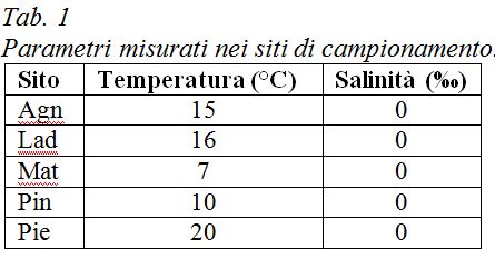 Per ciascun sito di campionamento sono stati misurati e annotati parametri fondamentali, quali la temperatura dell’acqua (misurata in situ) e la salinità (misurata in laboratorio) (Tab. 1).