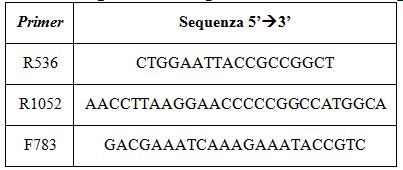 Come marcatore genetico specie-specifico è stato selezionato uno dei marker genetici più utilizzati in Protistologia per studi di filogenesi molecolare e di caratterizzazione genetica delle specie, cioè il gene nucleare dell’RNA ribosomiale (rRNA) 18S. Il marcatore genetico selezionato è stato amplificato mediante la tecnica della PCR (Polymerase Chain Reaction), utilizzando il primer forward 18S F9 (5′-CTGGTTGATCCTGCCAG-3′) (Medlin et al., 1988) e il primer reverse 18S R1513 Hypo (5′-TGATCCTTCYGCAGGTTC-3′) (Petroni et al., 2002). Le reazioni di amplificazione sono state eseguite aggiungendo aliquote di DNA (100 ng) a una miscela di reazione da 50 μL contenente 2 mM MgCl2, 250 mM dNTP, un’unità di Taq DNA polimerasi (Merk Life Science, Milano, Italia) e 0,2 mM di ciascun primer. Le reazioni di PCR sono state eseguite nello strumento GenAmp System PCR 2400 (Applied Biosystems, Monza, Italia), impostato con i seguenti parametri: una fase di denaturazione iniziale a 94 °C per 1 minuto, seguita da 35 cicli a 94 °C per 30 secondi, a 50 °C per 30 secondi e a 72 °C per 1 minuto, con una fase di estensione finale a 72 °C per 10 minuti. I prodotti di PCR sono stati visualizzati in un gel di agarosio all’1% e le reazioni positive sono state sequenziate con tre primer interni alla sequenza genica amplificata (Tab. 2).