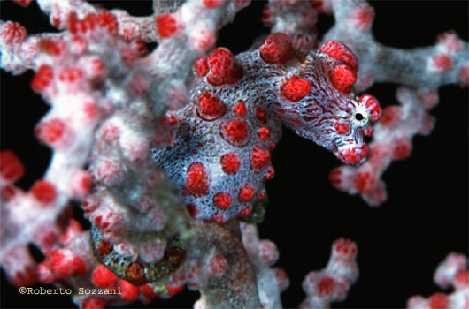 In questa bellissima foto un cavalluccio Hippocampus bargibanti perfettamente mimetizzato su un ramo di corallo. (Foto Roberto Sozzani)