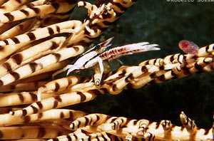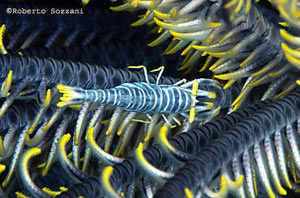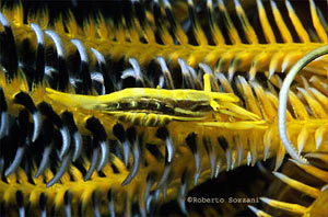 Gamberetti Periclimenes incredibilmente mimetizzati su dei Crinoidi. (Foto Roberto Sozzani)