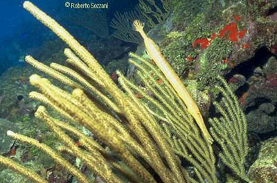 Aulostomus maculatus si nasconde prendendo l’identica posizione di una gorgonia. (Foto Roberto Sozzani) |