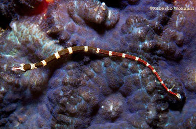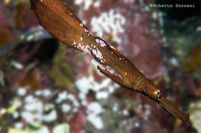 Il Pesce ago Corythoichthys amplexus. Spesso si nascondono lasciadosi trasportare dalla corrente insieme a gruppi di alghe, rametti e altri residui. (Foto Roberto Sozzani) |