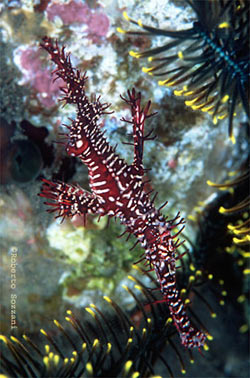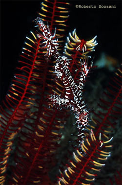 Solenostomus paradoxus nascosti nelle vicinanze di un Crinoide. (Foto Roberto Sozzani)