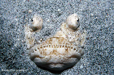 Papilloculiceps longiceps (Pesce coccodrillo) mimetizzato nella sabbia in attesa della preda. (Foto Roberto Sozzani) |