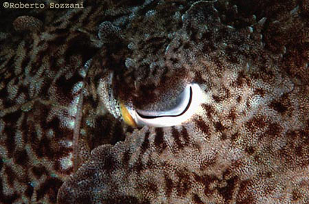 Primo piano dell’occhio di una seppia. Si può notare bene il dettaglio dei tessuti. (Foto Roberto Sozzani) |