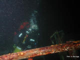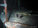 Due sono i modi per trovarlo, la discesa lungo una catena che parte quasi dalla riva ed è stesa lungo il declivio del fondale, oppure una discesa in verticale lungo una cima che “cade” vicino alla prua dello scafo, per poter fruire della seconda soluzione però bisogna farsi una nuotata in superficie fino ad una boa di colore blu che dalla riva si nota appena; noi optiamo per questa seconda alternativa poiché scendendo lungo il fondale rischieremmo di alzare un po’ di sospensione a causa del sedimento molto leggero che lo compone, con il risultato che poi ci cadrebbe con tutta probabilità proprio sul relitto rovinando così la possibilità di fare qualche scatto….