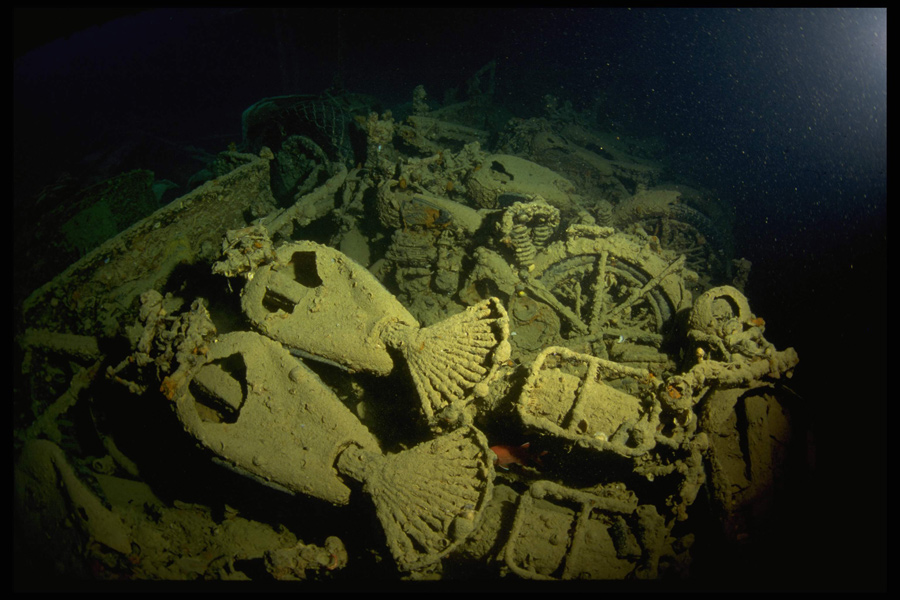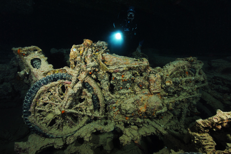 La seconda immersione ci conduce nella stiva del carbone, completamente nera, e poi nelle stive intricate della nave, dove abbiamo ammirato i resti del suo carico. Carri armati e motociclette giacciono congelati nel tempo, i loro telai metallici incrostati di corallo e circondati da una varietà di vita marina.