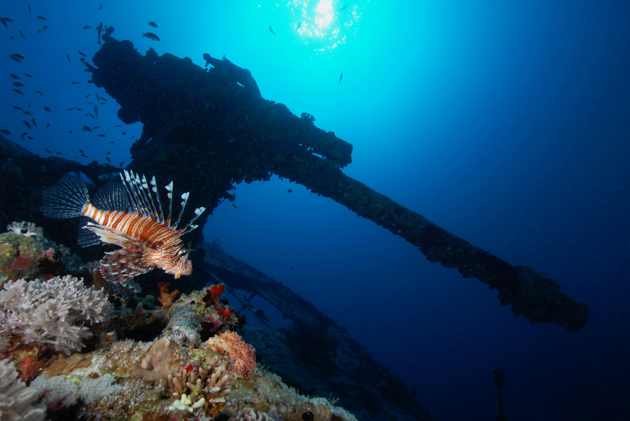Guidati dal nostro esperto, nuotiamo lungo l’esterno dell’imponente nave, che un tempo misurava 126 metri (ora leggermente più lunga perché divisa in due). L’area esplosa verso la poppa mostra l’intera portata della forza dell’esplosione. Ci allontaniamo di una quindicina di metri dal relitto per esplorare la locomotiva Stanier 8F, scagliata via dal ponte nonostante il suo peso di oltre 70 tonnellate. Sento un brivido di eccitazione mentre ci avviciniamo alla poppa e agli incredibili cannoni adornati da pesci scorpione, ancora montati e apparentemente pronti all’azione. Sorvolando nuovamente la zona esplosa, ripercorro con lo sguardo la sagoma di un trasporto truppe Bren Gun, che mi riporta alla memoria ciò che accadde a questa nave colossale e al suo carico.