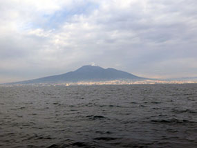 Il mare è calmo, vento debole, la temperatura esterna è intorno ai 5°, il sole gioca incerto tra le nuvole che hanno un colore grigio chiaro, una splendida costiera a babordo con le rocce frastagliate, e a tribordo la vista del Vesuvio innevato, che meraviglia queste visioni di un paesaggio naturalistico che mi lascia sempre una grande emozione nel vederlo.