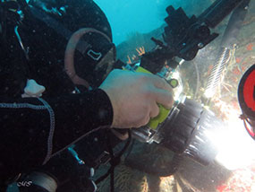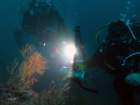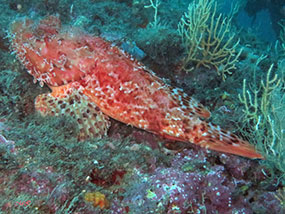 Do un’occhiata alla custodia della G per vedere se è tutto ok, timore del rischio allagamento e per fortuna va tutto bene. Arrivati sul cappello a 23 mt. Diamo un occhiata in giro per vedere la corrente dove tira, e cosi comincia la nostra immersione tanto attesa, guardo Rafael e Gabriella con le loro potenti buddy meccaniche (le fotocamere reflex) e resto compiaciuta nel vederli, è uno spettacolo guardarli in azione con le lampade che si dirottano su punti della parete rocciosa per svariati avvistamenti di scorfani, i quali, soprattutto con Gabriella, non si lasciano immortalare tanto facilmente e cosi dopo un bel gesto plateale della mia compagnella fotosubbina, nella quale si leggeva tutto il suo disappunto, proseguiamo con l immersione tra le mie bolle di risate.