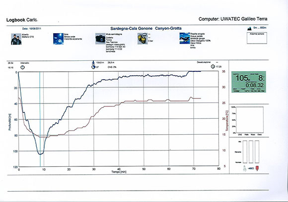 Uno stacco deciso dal fondo, e su verso una lunga decompressione ricca di abbracci di contentezza, di strette di mani e strane pacche sulle spalle ( in acqua non vengono bene ) , cambiando con la miscela intermedia 14/40, poi con un 25/25 per passare all’Ean 50 e chiudendo tutti a bandiera sul pedagno con ossigeno puro, assieme ai compagni di assistenza e ai nostri novantasette minuti di immersione. Alla sera, la grande ospitalità sarda ed il calore degli amici, ha soddisfatto tutti con una ottima cena, annaffiata finalmente da una buona dose di Mirto : l’indomani non si sarebbe potuto rifare il medesimo tuffo per le pessime condizioni del mare e ci siamo rifugiati tuffandoci alla grotta Bel Torrente, infilandoci per circa 350mt all’interno sotto il controllo di Stefano e Alberto. Esperienza inedita ed indimenticabile per alcuni di noi ! E’ passata anche la primavera ed è ritornata l’estate, con il consueto ritrovo con gli amici sardi: una sola occhiata…… un pensiero comune, forse rischioso