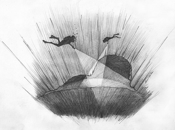 E’ vero che il sesto senso molte volte non tradisce ed infatti, i due amici tempo fa già decisero di fissare un saldo pedagno alla cigliata, per poi da qui proseguire ed allargare le esplorazioni. Ed allora, ci vollero due o tre tuffi per fissare una bella cima e bidoni collegati per andare sul sicuro . Ed è anche vero, che il subacqueo tecnico alla fine ….affonda sempre di più, e si domanda : “ Che ci sarà la più sotto dove il mare cambia colore ? “ Detto…. Fatto !!! Trovarono ben presto una misteriosa spaccatura nella roccia, ed un foro semi circolare alla profondità di circa 80 mt : il fascio della torcia inspiegabilmente si perdeva nell’oscurità ……..!!!!!!! Triplo WOW !!!!!!!