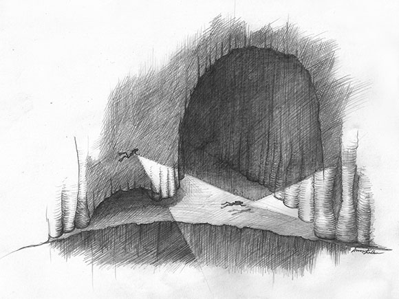 Alberto come al solito ha sapientemente sagolato la nostra discesa, dalla cigliata alla base del pedagno, fino alla volta della grotta, fissando il reel ben in vista per la risalita, ad uno dei pericolosi lembi di rete incagliati a 90 mt . Imbracciando la telecamera Go-Pro prestata gentilmente dal buon Toddy con lo scafandro testato a 150 mt di profondità, ha poi incominciato a filmare l’imboccatura , riuscendo anche a scattare qualche foto alle pareti contornate di grossolane colonne : sembrava di entrare in uno strano mondo fiabesco ….