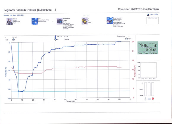 time totale di 112 minuti: si , una decompressione lunghissima, appesi come salsicce alla cima del pedagno, dove siamo arrivati anche a raccontarci le barzellette in acqua, ma ne è valsa proprio la pena !