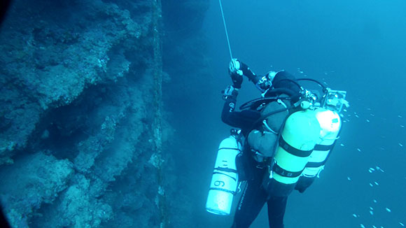 Abbiamo effettuato due immersioni, portandoci appresso il solito grappolo di bombole e la solita ragnatela di fruste ed erogatori diversamente colorati : un bibo 15+15 contenente miscela di fondo 11/50 e miscela di trasporto 14/30 per coprire la fascia media/profonda dell’immersione; abbiamo aggiunto un mono da 10 litri di aria, – (l’aria, come dice qualcuno, serve solo per gonfiare le gomme, ma a noi può essere comoda per coprire eventuali emergenze fino a considerevoli profondità)- per ulteriore trasporto dalla superficie fino al cappello della cigliata a 50 mt ed in ritorno da 50 mt fino a prendere un mono da 10 litri di ean 40 a 30 mt , concludendo con