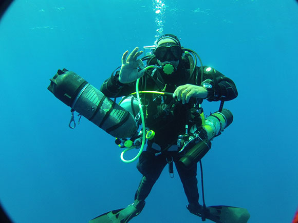 tempo !!! Con il supporto tecnico-navale di Fabio Sagheddu, — ci siamo dovuti incastrare anche con i suoi impegni, (… di certo più incasinati che Nettuno e le mogli …) che ci ha preparato nel suo laboratorio i giusti e corretti “intrugli” , con miscele trimix e nitrox, raschiando con la sua centralina anche l’ultimo bar di elio, siamo usciti con il suo gommone- ammiraglia, dotato di vari ombrelloni da sole (molto coreografici ) e ci siamo preparati al tuffo.