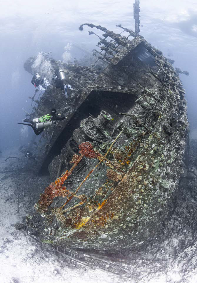 Nuotando all’indietro, possiamo trovare punti di sosta sufficienti per fare le nostre soste e riemergere in sicurezza. Le nostre guide saranno liete di guidarvi attraverso le diverse aree della nave per non farvi perdere nulla di questo bellissimo relitto.