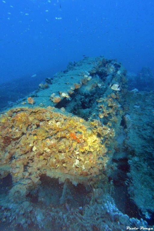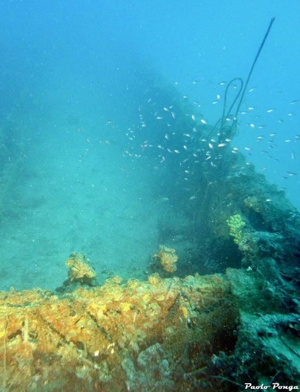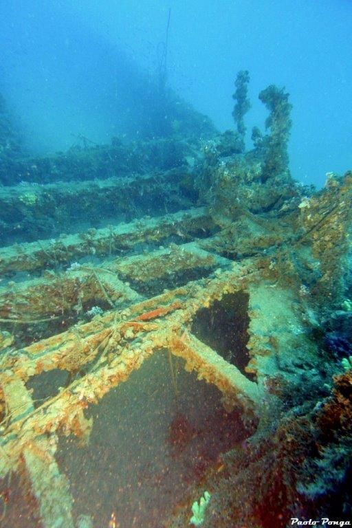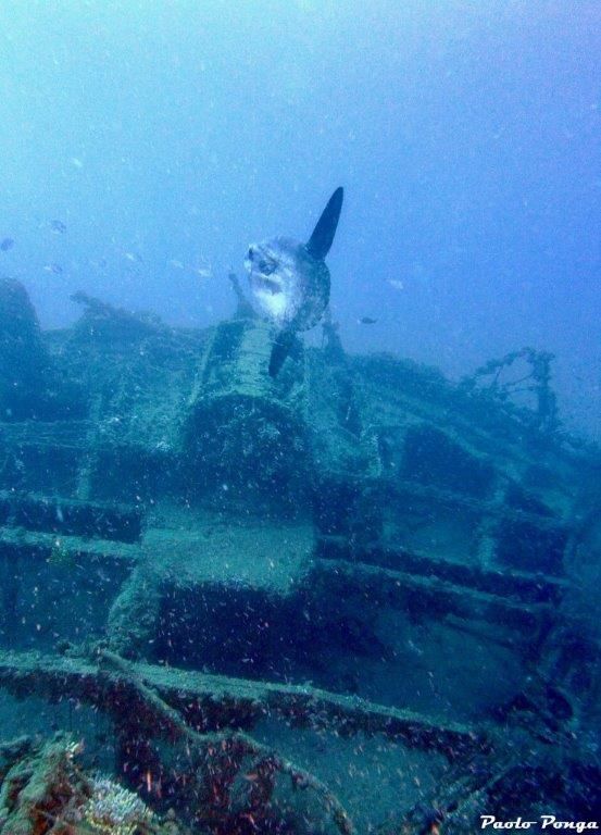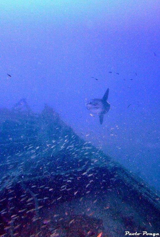 Oggi purtroppo la parte sotto il ponte di coperta e le stive stesse sono in mezzo ad una densa nebbia, impedendomi di scattare foto; il ponte è invece discretamente visibile soprattutto vicino alla poppa. Tentiamo di dirigerci verso lo squarcio, ma non è proprio giornata e quindi ritorniamo presto sui nostri passi. Improvvisamente mi trovo davanti un pesce luna, uno splendido Mola Mola che mi osserva e poi velocemente scompare nel blu; sono però riuscito a fare due scatti e sono felicissimo… e quando mi spiego a gesti con la mia giovane guida, ad essere disperato è invece lui. Ma sono cose che accadono: questa volta la fortuna è stata almeno un po’ dalla mia parte.