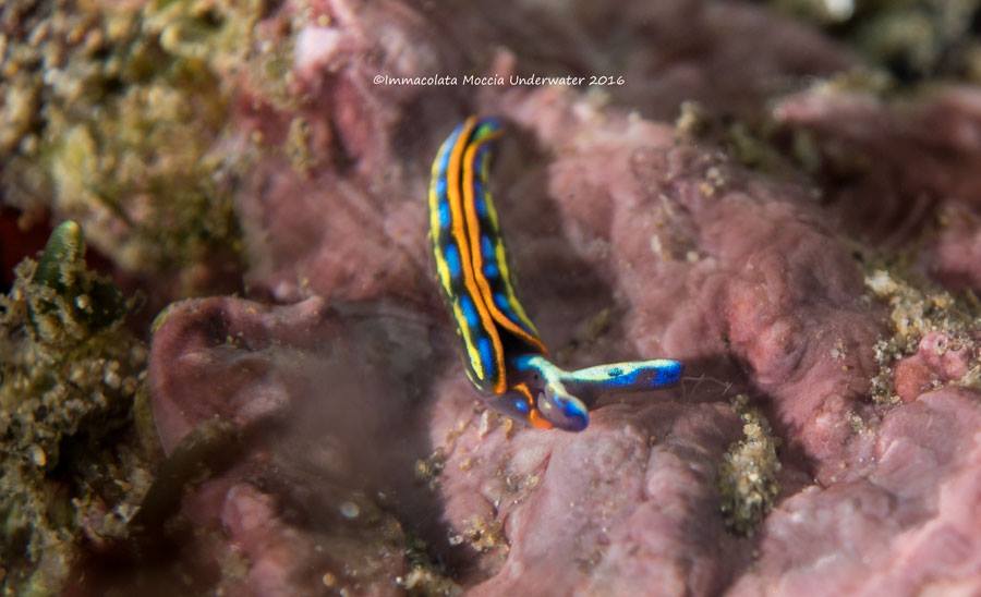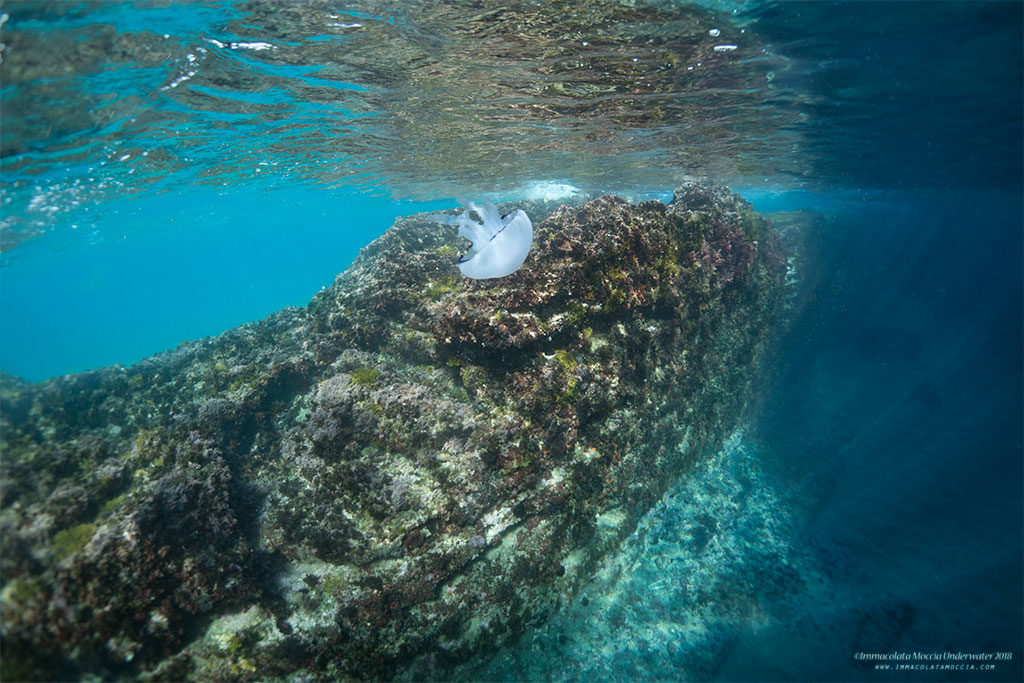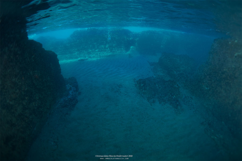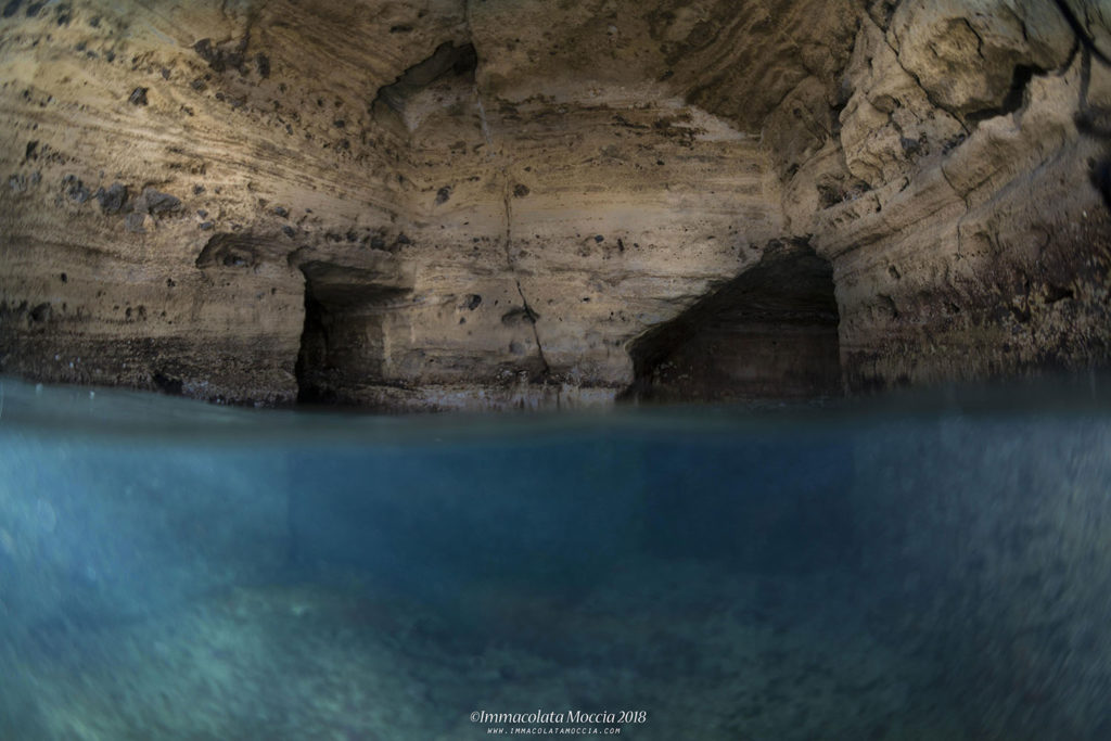 Dalle prime volte in cui ho cominciato ad immergermi in questa zona, ne sono rimasta molto colpita in quanto sotto la superficie dell’acqua visibili già nei primi metri ci sono i resti di peschiere appartenenti alla Villa di Lucullo, che a causa del bradisismo sono sommerse in circa due metri d’acqua, parziali mura perimetrali di ambienti scavati nel tufo, passaggi semisommersi che conducono in cisterne d’acqua misto al fascino di trovare su queste mura tante forme di vita bentoniche attecchite ed altre invece pelagiche.