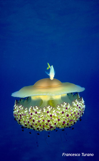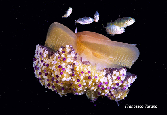Mi godo il mare e i suoi toni di azzurro, a tratti spezzato da grandi meduse dal fascino unico. In autunno passano le cassiopee, meduse non urticanti per l’uomo, dai colori sgargianti che variano dall’arancio che sfuma nel giallo dell’ombrella, al bianco puntinato di viola dei tozzi tentacoli. Tra questi e l’ombrella, in spazi cavi che ricordano vagamente la struttura di un cavolfiore, si rifugiano gli stessi carangidi che avevo visto sotto il galleggiante del corpo morto, ma un po’ più piccoli, insieme a giovani pesci pilota e a volte qualche sugarello. La “giostra” di pesciolini che si muovono sotto la protezione della medusa è una delle cose che amo di più osservare: mi entusiasma, è coinvolgente, ed è una scena bella e difficile da fotografare, sempre che si voglia cercare di documentare l’essenza di una scena ed il suo vero significato, senza limitarsi soltanto alla pura e semplice documentazione.