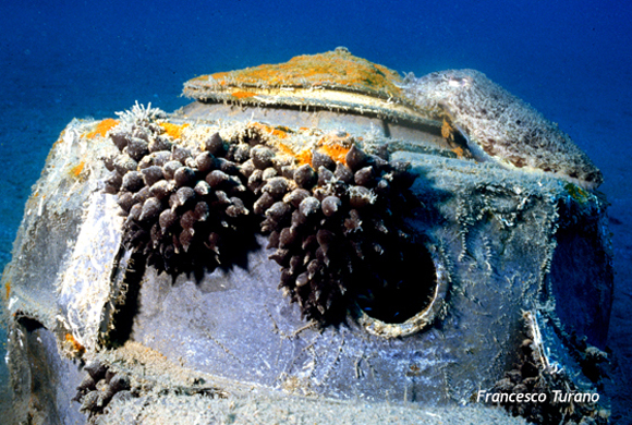 Nuoto lasciando ondulare le pinne con movimenti accennati e un metro alla volta raggiungo il relitto di un corpo morto in cemento, con relativa catena e galleggiante. Due mesi son stati sufficienti a questo insignificante substrato per diventare oasi di vita: la pietra è ora abitata da un giovane polpo mentre la cima, che tiene annodata la catena, è supporto per un grappolo di uova di seppia. La catena vera e propria è invece colonizzata da diversi idrozoi, celenterati che con le loro morbide fattezze si spostano da un lato e dall’altro come piumini in balia d’un soffio di vento a singhiozzo.