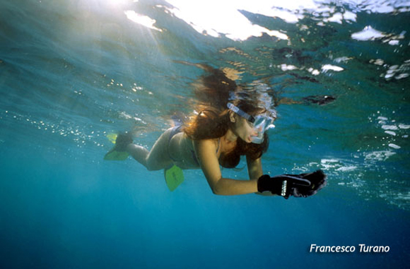 Le pinne ondeggiano lente e continuano a spostarmi da un punto all’altro della superficie di questo specchio d’acqua che ho scelto di esplorare questa sera. Gli incontri son tanti, anche se a prima vista potrebbe sembrare di nuotare in una vuota piscina dal fondo di sabbia. Tenendo lo sguardo alto, con il collo che duole per la posizione innaturale necessaria per guardare appena sotto la superficie, vedo lunghe e argentate aguglie nuotare flessuose; con guizzi molto rapidi sfilano anche piccoli esemplari di leccia stella, pesci curiosi per l’incredibile coda a “V” che gli consente movimenti scattanti, come sovente accade tra i familiari dei carangidi. Arrivano, ti osservano, virano e scappano; poi tornano, poi scappano di nuovo. L’importante è non seguirle; se le segui lo sentono, e scompaiono. La frenesia del nuoto, che contraddistingue questi pesci e li caratterizza sin dalla tenera età, quando ancora si muovono soltanto tra i tentacoli di una medusa, è affascinante: è il primo passo verso il nuoto veloce necessario per frequentare il mare aperto, necessario per sfuggire ai predatori… La natura, quanto è grande. Ho goduto abbastanza di questo pomeriggio d’inizio autunno e mi avvio verso riva sereno. Un giorno, spero, mostrerò tutto questo a mio figlio.