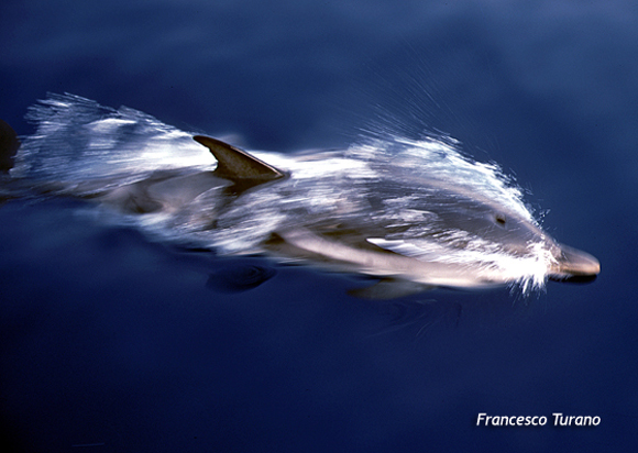 Ora in un senso ora nell’altro, con intervalli brevi, le aguglie saltano ancora. Ma d’improvviso capisco il perché: sono inseguite da lampughe, veloci forse più di loro, lampughe a caccia, in preda alla frenesia. Che emozione… Ma ci son pesci ovunque: moltissime alici fremono sotto la superficie lasciando il segno evidente della loro presenza, il mare sembra ribollire. Lo sguardo si muove attento lungo l’immensa distesa celeste illuminata dagli ultimi raggi del sole, ormai pronto a nascondersi all’orizzonte, dietro il grande vulcano siciliano. Le alici saltano insieme, numerose, poi di nuovo le aguglie: la mente prova a immaginare cosa accade sott’acqua e per una volta mi muovo solo col pensiero, senza fotocamera. Non sono solo lampughe a cacciare quei pesci; c’è qualcosa che a sua volta insegue le lampughe… ma sono delfini!