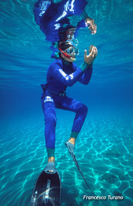 Foto a sinistra: un subacqueo osserva una medusa in apnea