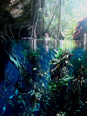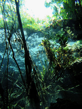 La vegetazione si tuffa nelle acque dei cenotes e dalla profondità di diversi metri si può vedere l’ambiente esterno senza quasi distorsioni dell’acqua. Un altro regalo dei cenotes che ci cattura e ci porta a risalire spesso in superficie per ammirare il paesaggio da mezz’acqua.