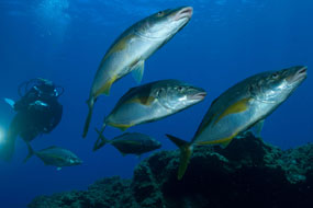 A sinistra: Pseudocaranx dentex, un carangide frequente in piccoli gruppi.