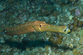 A destra: Il pesce trombetta Aulostomus strigosus, specie dell’Atlantico