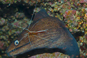 A destra: La Muraena augusti, tipica di quest’area, si fa pulire dal gamberetto