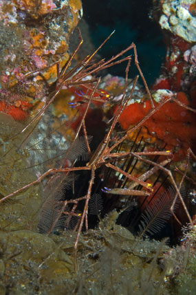 A destra: Il granchio freccia africano Stenorhynchus lanceolatus.