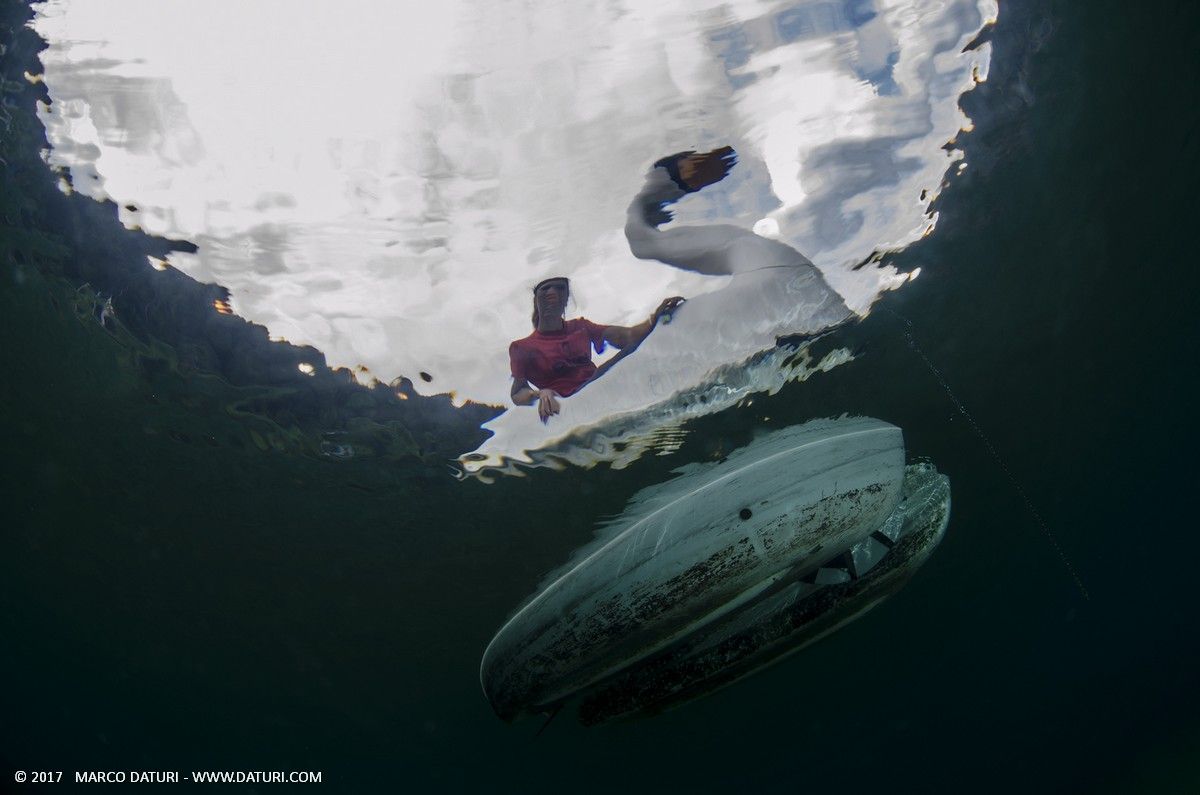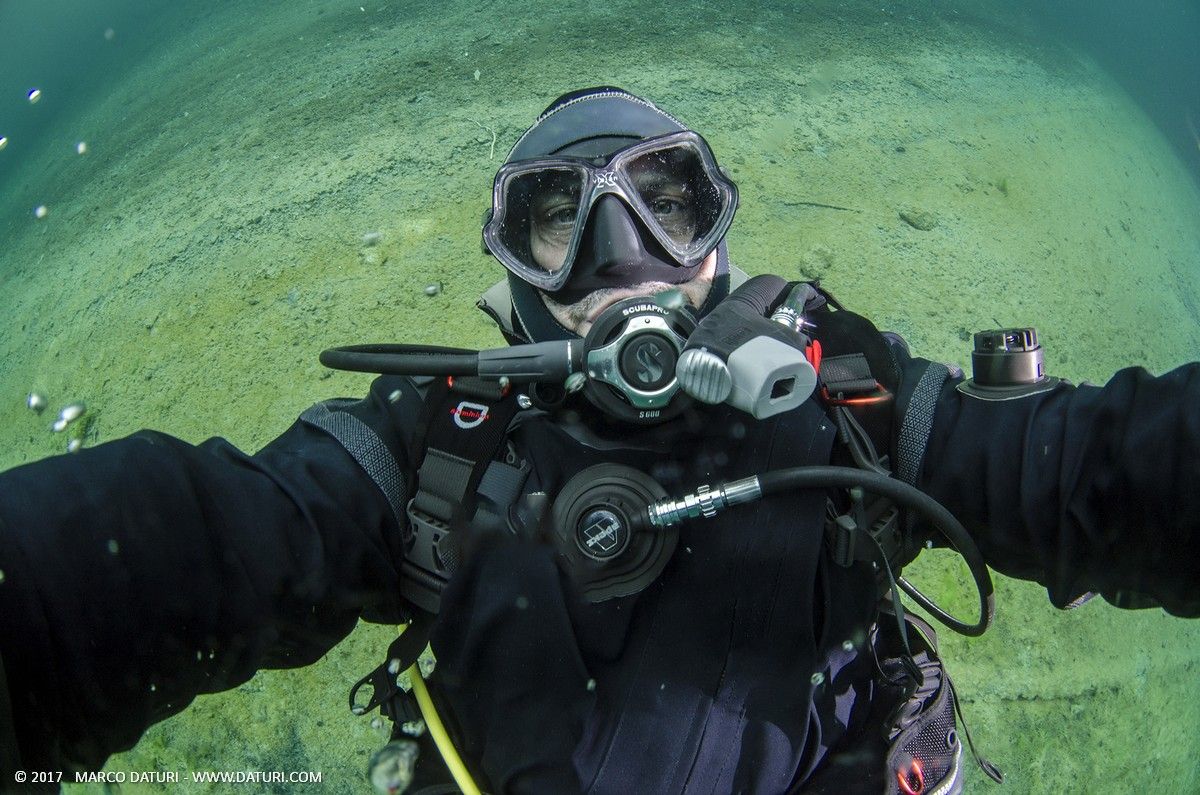 L’acqua è piuttosto fredda e appena sotto la superficie si vede il termoclino con la temperatura che scende da 12 a 6°C. Siamo naturalmente ben attrezzati per queste temperature che risultano persino piacevoli.
