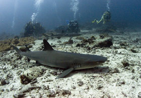 Ma cosa c’è da vedere a Sipadan??? Di tutto di più. Durante le immersioni potevi vedere una decina di squali pinna bianca nuotare o posati sul fondo a riposare, spesso però scappare appena ti avvicinavi. Per poterli beccare abbastanza da vicino dovevi proprio avvicinarti molto ma molto lentamente senza fare nessun movimento brusco e respirare il meno possibile. C’erano gli squali leopardo e se andavi sotto i 30 m potevi vederti i grigi e se fortunato i martello.