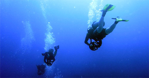 Il BLUE DIVE è un’immersione molto particolare, per un pubblico particolare che a sua volta cerca qualcosa di particolare. Può essere un’immersione dove la forma di vita più interessante (dopo le subacquee ed il sottoscritto) è il plankton, come ci si può imbattere in una galleria di decine e decine di MOSTRI. Non ci sono riferimenti, solo blu, e per quanto ci si sforzi a prevederla, prevenirla, calcolarla… la corrente ci porterà chissà dove. Il sistema ideale è lanciare ad inizio immersione, da dieci metri circa, il pallone di segnalazione (meglio un SMB di circa un paio di metri, alto e visibile sulla superficie) e scendere rimanendo appesi, alla quota desiderata. Uno è sufficiente per un intero gruppo. Per gruppi numerosi può essere utile lanciarne due, ma mai di più per evitare aggrovigliamenti, e piazzarli in mano a chi apre e a chi chiude il gruppo.