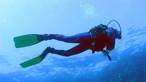 E’ possibile pinneggiare contro una corrente debole, guardando un oggetto senza finirci contro, mettendosi in posizione seduta e muovendo solo le pinne, non le gambe, a rana. E’ chiaro che per muoversi in quel modo senza danneggiare i coralli bisogna saperlo già fare in orizzontale.