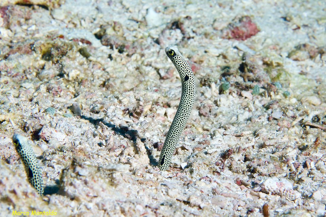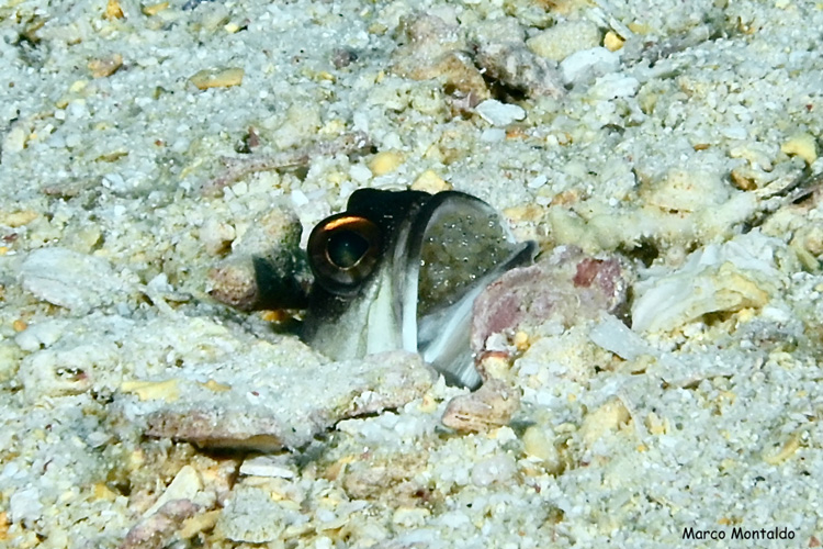 Pochi metri più avanti ecco sbucare dalla sabbia un altro pesce veramente particolare. Si tratta di un jawfish (Opistognathus Randalli), siamo fortunati, infatti tiene in bocca le uova fecondate che si schiuderanno in 5 giorni circa, dando alla luce i suoi piccoli.