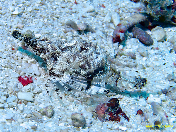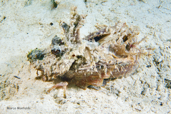 Poco oltre un altro maestro di mimetismo, un pesce diavolo (Inimicus Filamentosus), anche lui cammina sul fondo, raramente se disturbato può fare dei piccoli scatti di poche decine di centimetri ma più che altro si fida del suo camuffamento che lo rende quasi invisibile, guai però al piccolo pesce che gli passa davanti: un attimo e sparisce risucchiato nella sua bocca!