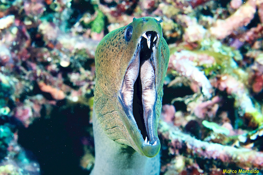A proposito di bocca, poco oltre ci imbattiamo in una murena (Gymnothorax Javanicus) dalla bocca spalancata. È normale vedere le murene aprire la bocca, lo fanno per respirare, ma questa sta veramente esagerando!