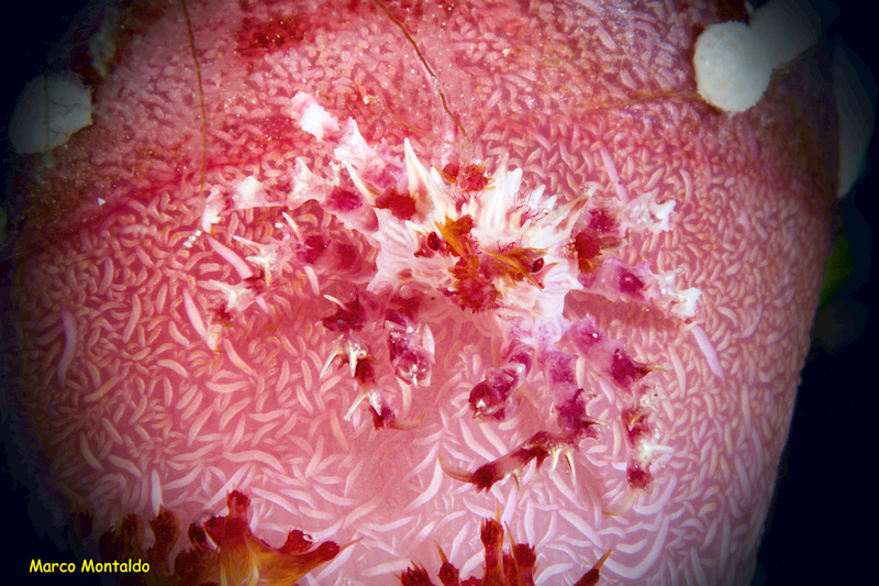 Poco oltre su un alcionario rosso vediamo un granchio caramella (Hoplophrys Oatesii) che ha le sue stesse sfumature di colore. Per tutti questi piccoli esseri il mimetismo è fondamentale per nascondersi dai predatori ma anche a loro volta per predare animaletti ancora più piccoli che non si accorgono del pericolo fin quando è troppo tardi.